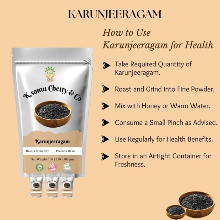 For pure and traditionally sourced Karunjeeragam, consider purchasing from K Somu Chetty & Co – a trusted name in natural and herbal products in Tamil Nadu. They offer handpicked, chemical-free Karunjeeragam that is safe for daily consumption.