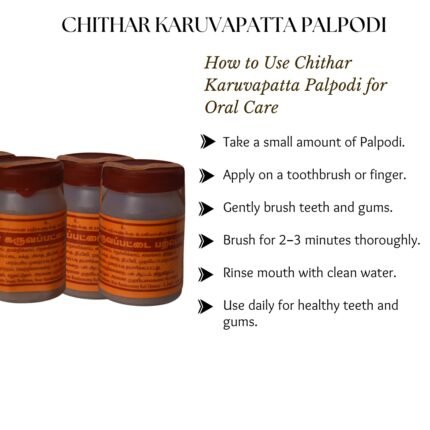 Chithar Karuvapatta Palpodi is a herbal tooth powder designed for strong, healthy, and bright teeth. Made with natural ingredients, it helps whiten teeth, strengthen gums, eliminate bad breath, and prevent dental issues like plaque and cavities. Safe for daily use, this product offers a chemical-free way to maintain oral health. Available online at K.Somu Chetty & Co., it comes at competitive retail and wholesale prices.