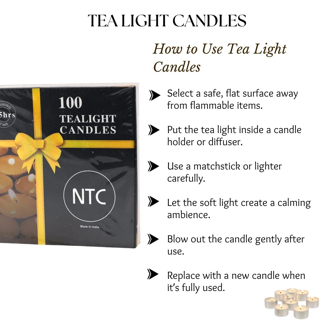 The tea light candles are available in packs of 50 & 100; these candles are unscented and do not leave any wax stains. Each tea light candle weighs 10 grams; these compact tealight candles fit easily into tealight holders, which can be used to decorate your house for festive purposes and celebrations.